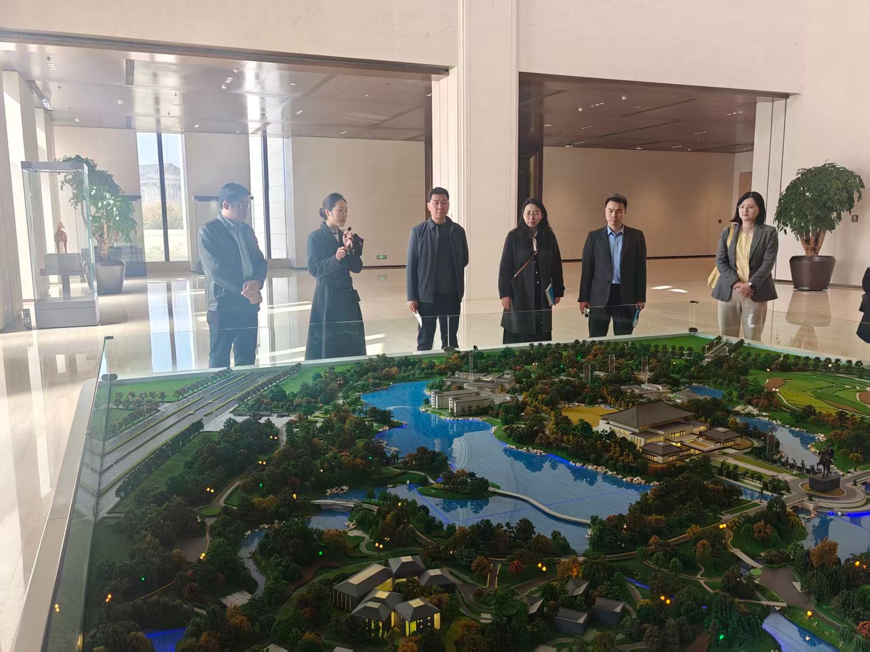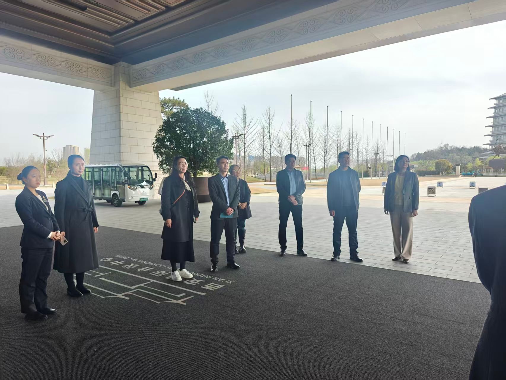 在企业工作人员的精心引导下,校方代表团首先参观了会议中心1号楼核心区域。这里作为中国-中亚峰会的重要举办场地,留存着众多重大外事活动的珍贵印记。工作人员现场细致讲解了中亚峰会举办期间的盛况与服务细节,重点介绍了麟德厅、建章厅等标志性会议厅的功能布局、设计理念及高端会议服务标准。麟德厅的敦煌元素水晶顶、建章厅融合唐代纹饰的穹顶设计,以及各场馆承接国际高端会议的专业配置,让代表团成员直观感受到大型国际会议的服务要求与文化内涵,为后续人才培养与志愿服务对接奠定了直观认知基础。