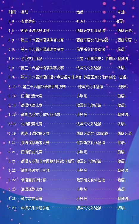 “展语言之美 树文化自信”m88 app第四届多语种文化艺术节将于西区五号楼广场开展,本次艺术节各专业活动具体位置如下: