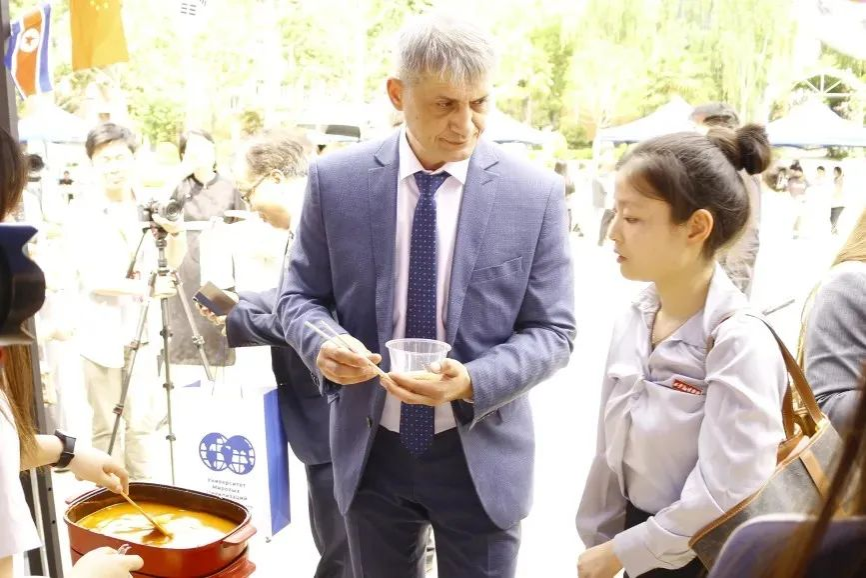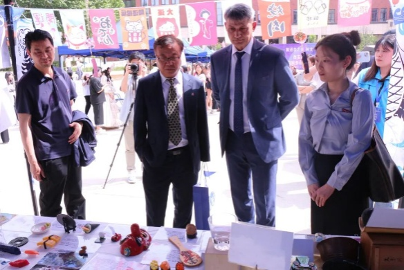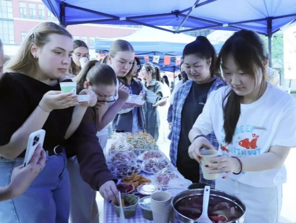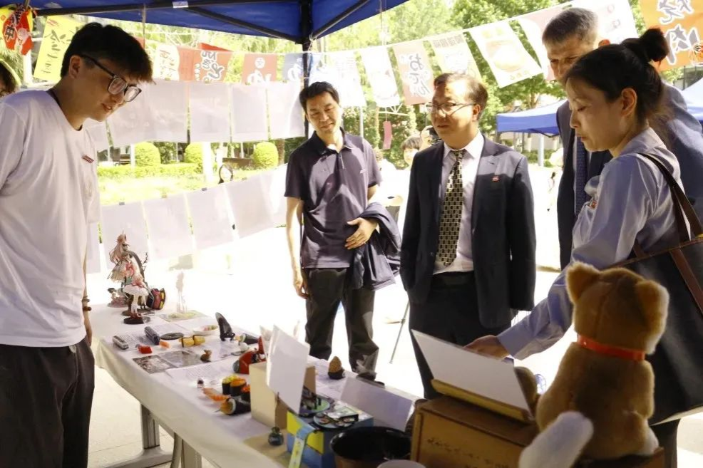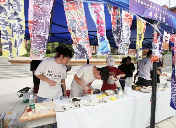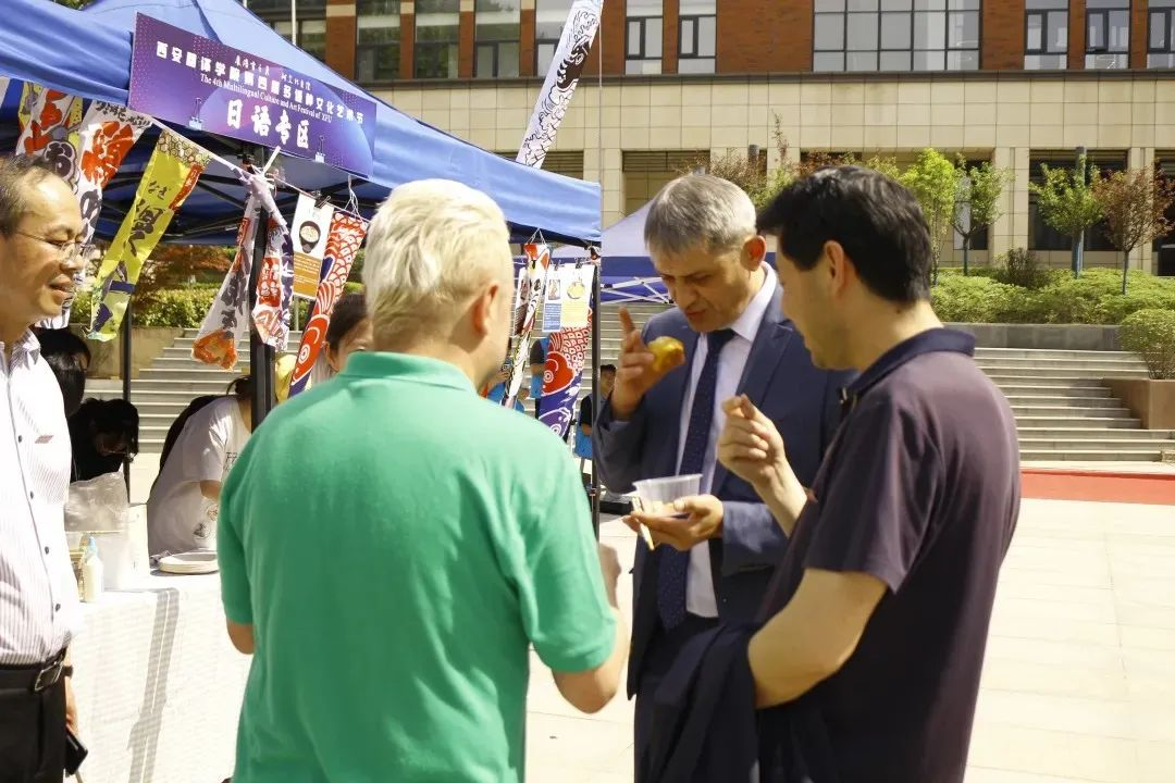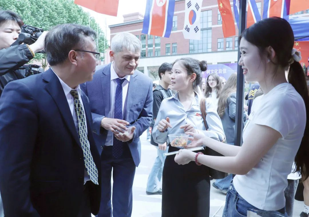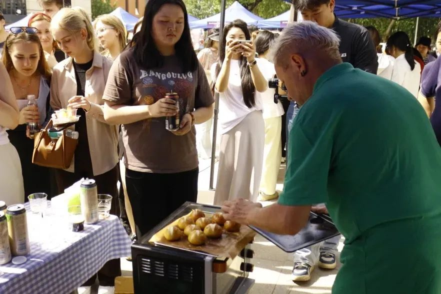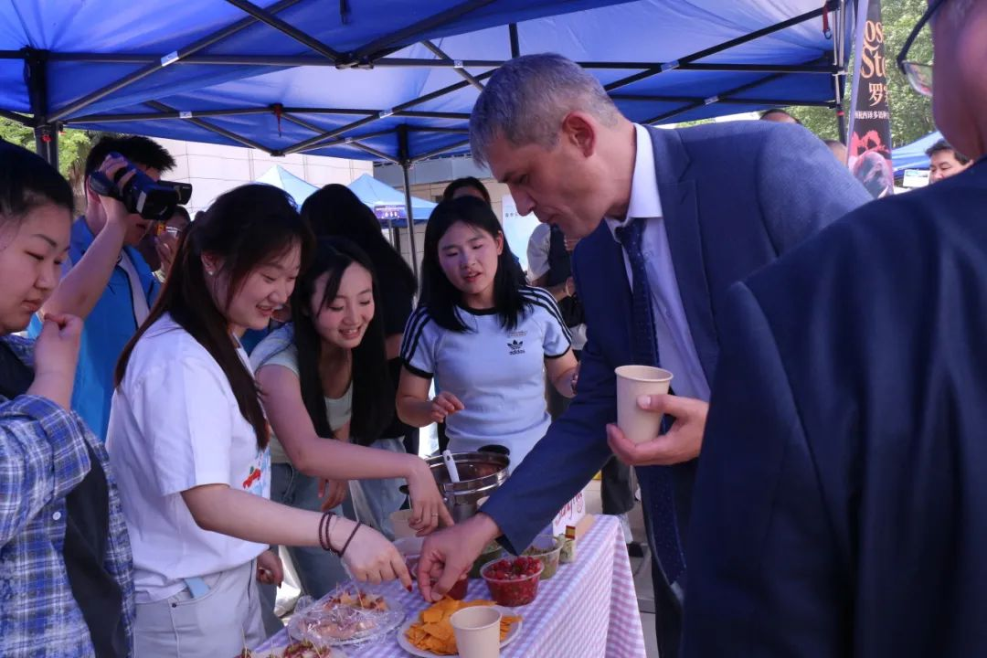 活动来到室外文化体验区,领导们品尝由学生亲手制作的各国特色美食。从精致的日式和果子、到香气四溢的卷饼,碱水面包。每一道美食都承载着不同国家的饮食文化,展现出学生们对各国文化的深入理解与实践成果。室外场所还设置了多语种展示、传统技艺体验等多个展区,丰富的活动内容吸引了众多师生驻足参与,现场学术氛围与文化气息交融,充分彰显了m88 app在推动多语种教育与文化交流方面的积极探索与卓越成效。